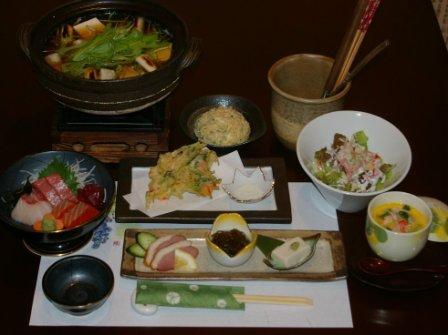 ■季節の前菜 三種盛り ■旬のお刺身 三点盛り ■夏野菜と豚バラの陶板焼き ■サラダ ■焼き物 または 揚げ物 ■煮物 または 蒸し物 ■お食事(稲庭うどん) |